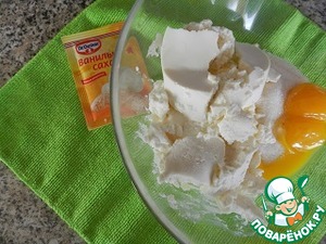В миске смешать мягкое сливочное масло, сахар, желтки и рикотту до однородности (ложкой). Добавить ванильный сахар (Dr.Oetker) и щепотку соли, перемешать.