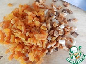 Курагу помыть, обсушить и нарезать кубиками. Ириски также нарезать мелкими кубиками.