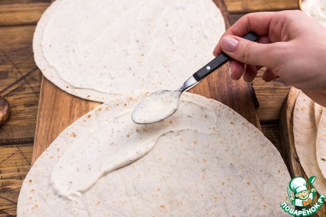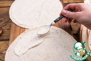 Разогреваем смесь масел в сковороде. Выкладываем 1 тортилью на сковороду.