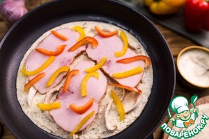 Распределяем волокна мяса, ветчину, кусочки перца, ломтики сыра.
