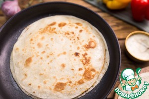 • Разогреваем смесь масел в сковороде. Выкладываем 1 тортилью на сковороду.