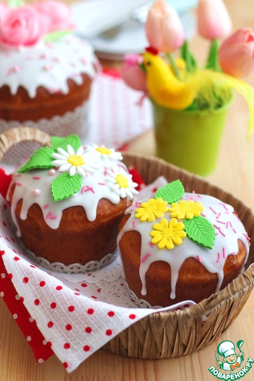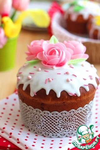 Готовое тесто выложить в формы для выпекания куличей. Заполнить формы на 1/3. формы накрыть полотенцем и оставить примерно на 50-60 мин. Затем формы поместить в разогретую до t180-190С духовку. Выпекать куличи до сухой лучины. Хочу обратить внимание, духовки у всех разные и каждый должен ориентироваться на возможности своей духовки и время выпекания самостоятельно. Готовые куличи украсить по вкусу. В рецепте я использовала кондитерскую посыпку, кондитерское сладкое кружево, готовую глазурь со вкусом лимона, вафельные цветы (готовые) и дополнительно приготовила цветы из сахарной мастики.