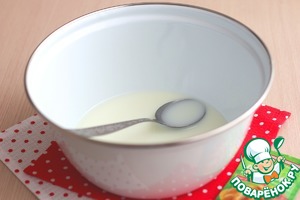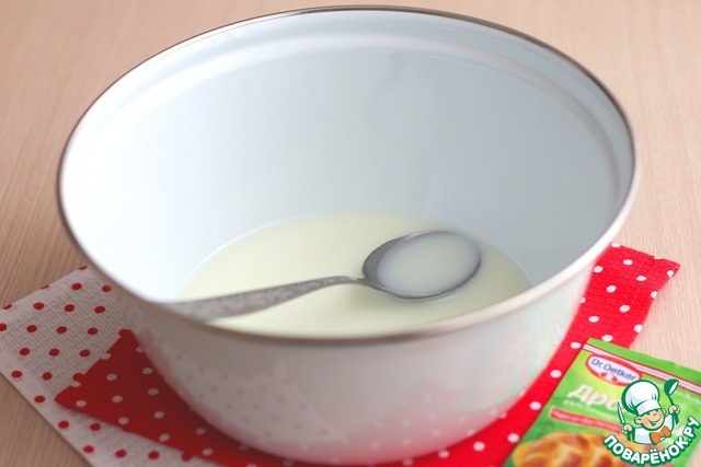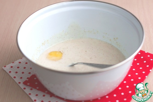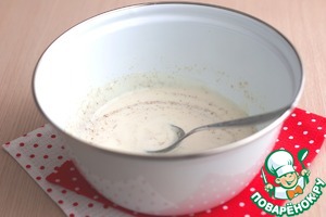 Добавить дрожжи (5 гр.), добавить ванильный сахар с натуральной ванилью (5 гр.). Смесь хорошо размешать, накрыть полотенцем и поставить в теплое место для роспуска дрожжей.