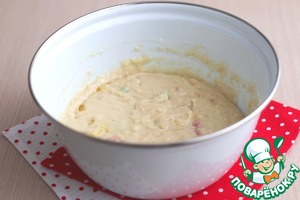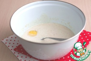Через определенное время на поверхности дрожжевой смеси образуется шапочка из мелких пузырьков, опара готова. Далее добавить яйца (3 шт.), добавить 1/2 ч. ложки соли, добавить оставшийся сахар. Смесь взбить вилочкой.