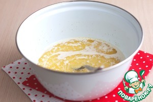 Сливочное масло (90 гр.) растопить, остудить. Добавить растопленное масло в смесь. Все хорошо размешать.