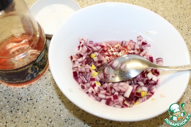 Первым делом замариновала лук, залила его столовой ложкой виноградного уксуса, добавила пару щепоток соли и столовую ложку воды. У меня уксус магазинный, он должен быть 6 %, но мне показался крепче и я разбавила. Как вариант, можно через минут 15 попробовать луковый кусочек и скорректировать кислоту, д. б. слабокислый, можно добавить половину чайной ложки сахара ( делала и такой маринад). Мариноваться должен все время пока суп готовится, т. е. 40 минут, потом лишняя жидкость сливается.