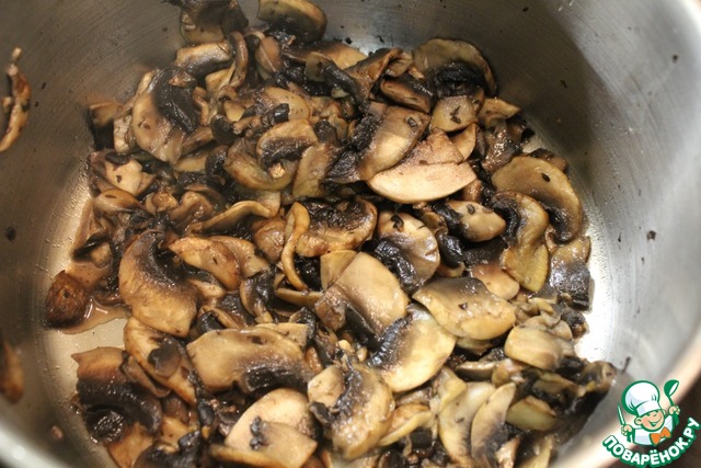 Затем добавила в кастрюлю грибы и готовила, помешивая пока не стали темнеть, добавила половину чайной ложки соли, перец по вкусу.