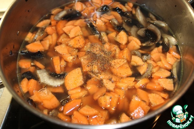 Добавила морковь и бульон, довела до кипения, уменьшила огонь и накрыла крышкой, варила пока морковь не стала мягкой. Добавьте при необходимости соль и перец, но не забывайте, что соль присутствует и в маринованном луке.