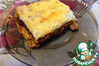 3. Соедините овощи и мясо. Тушите 1,5 часа под крышкой, до мягкости фарша. Немного сока должно остаться, т. к. листы лазаньи мы не варим. Если сока нет, а мясо ещё жесткое - добавьте немного воды.
