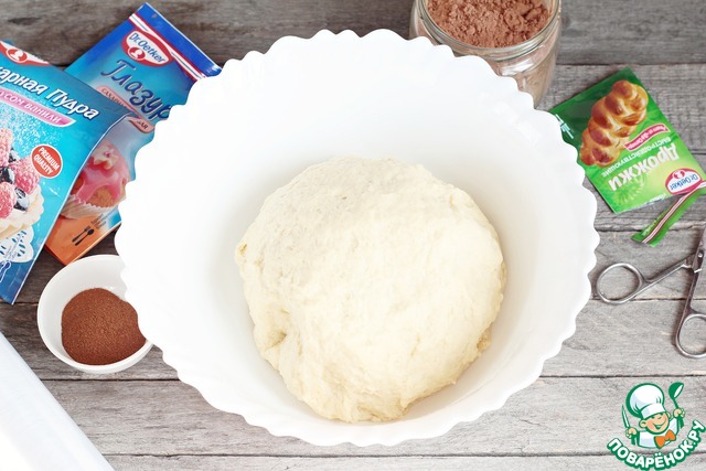Сливки (100 мл) нагреть, растопить в них масло сливочное (50 г) и растворить сахарный песок (3 ст. л.). Остудить полученную смесь до температуры, комфортной для активации дрожжей Dr.Oetker, добавить их (1 пак. - 7 г) и распустить.