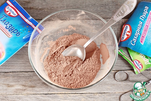 Какао-порошок (3 ст. л.), сахарную пудру Dr.Oetker со вкусом ванили (3 ст. л.) и молотую корицу (10 г) просеять через сито и тщательно перемешать.
