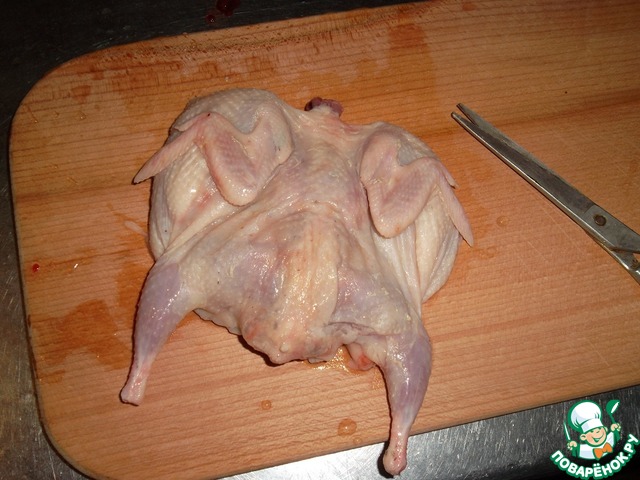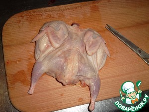 Тушки моем, обрезаем лишнее, ножницами разрезаем по грудке, раскладываем на доске и сильно прижимаем сверху рукой. Что бы «похрустели»!