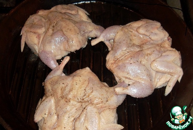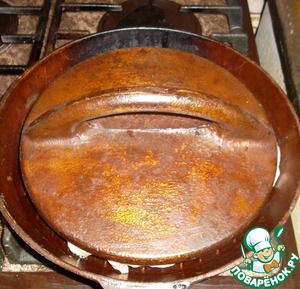 Прижимаем гнетом. Обжариваем до румяной корочки…