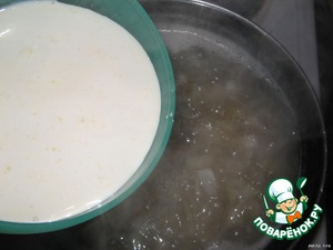 Когда картофель будет готов, добавить лук. Суп посолить по вкусу и поперчить. Сделать для супа заправку. В сливки добавить яйцо и немного взбить.