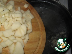 В кипящий куриный бульон добавить нарезанный кубиками картофель.