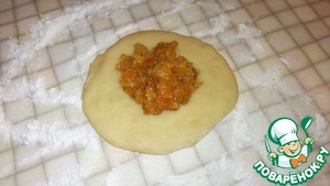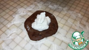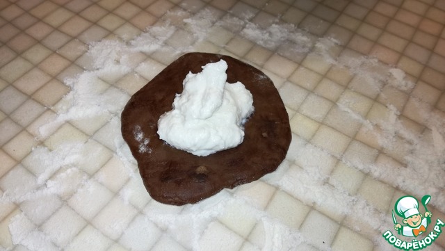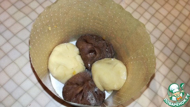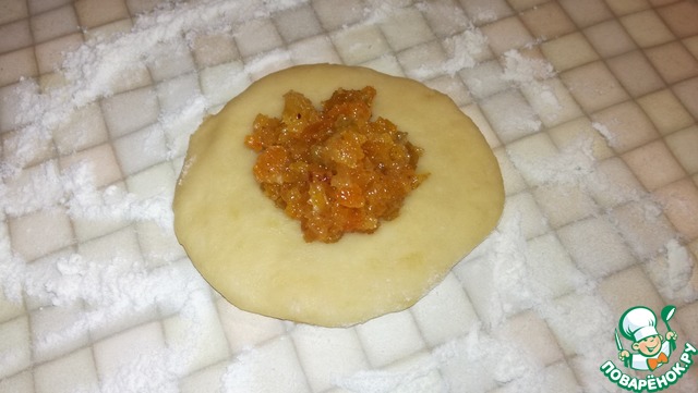 Раскатать каждый шарик и положить начинку, в светлое тесто курагу.