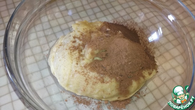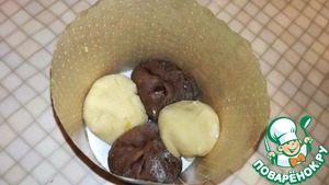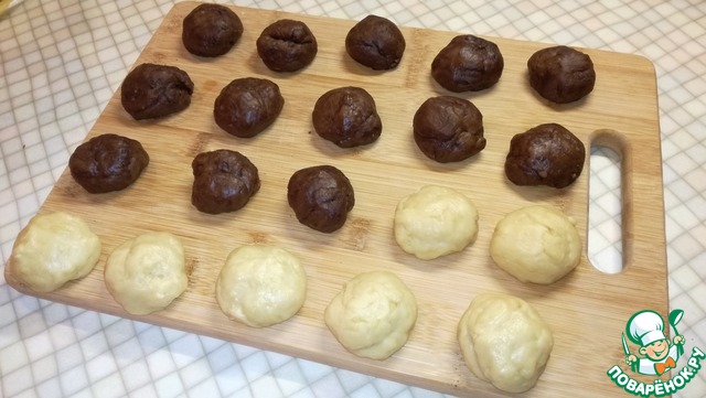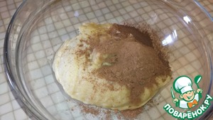 Тесто разделить на две части. В одну из частей добавить какао и хорошо вымесить. Накрыть миски и убрать в тёплое место на час до увеличения в объёме.