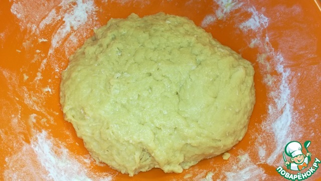 Постепенно добавить просеянную муку и замесить тесто. Оно получится липким, пусть Вас это не пугает.