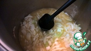 Когда появится характерный запах жаренного лука добавляем немного воды и даем луку протушиться до испарения воды, когда лук снова начнет жариться - даем ему пожариться минуту и добавляем воду опять. Так повторяем несколько раз (3 - 4 раза) - пока лук не станет совсем мягким и "расплывающимся"