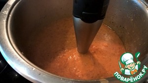 Добавляем в кастрюлю немного бульона и измельчаем содержимое до однородной массы погружным блендером