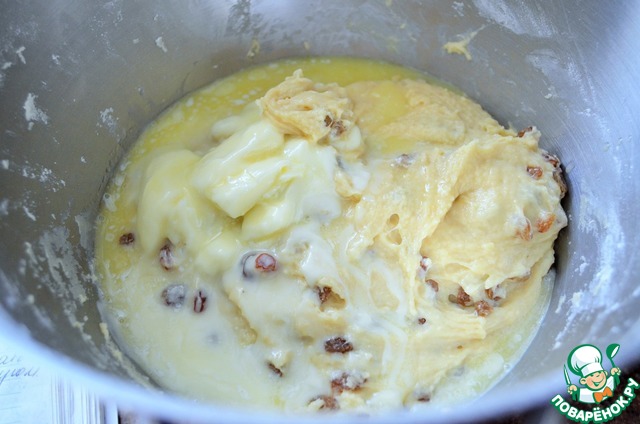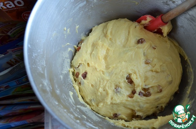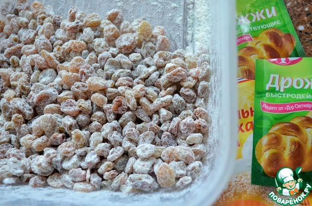 Промытый и обсушенный изюм обвалять в муке и добавить в дежу.