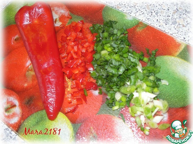 Промыть, очистить от семян красный болгарский перец и нарезать мелко кубиками. 3 пёрышка зелёного лука промыть и нарезать тоже мелкими колечками. -