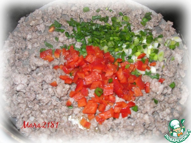 Сковороду поставить на небольшой огонь, налить 50 мл воды и поместить сюда 300 г мясного фарша (у меня свино-говяжий), потушить около 15-20 минут до выпаривания жидкости, постоянно помешивая. Теперь добавить примерно 2 ст. л. растительного масла и нарезанные болгарский перец с зелёным луком. Всё перемешать и обжарить вместе около 5 минут. В конце добавить соль и чёрный перец по вкусу. Снять с огня и дать остыть.