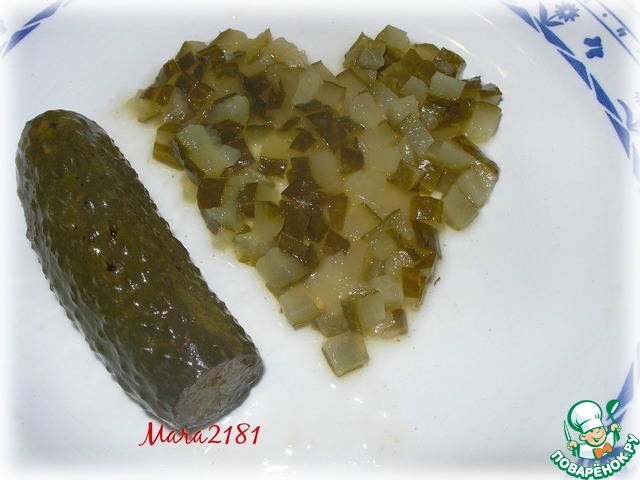 2 маринованных огурчика порезать мелкими кубиками, а лишнюю жидкость в процессе нарезания слить.