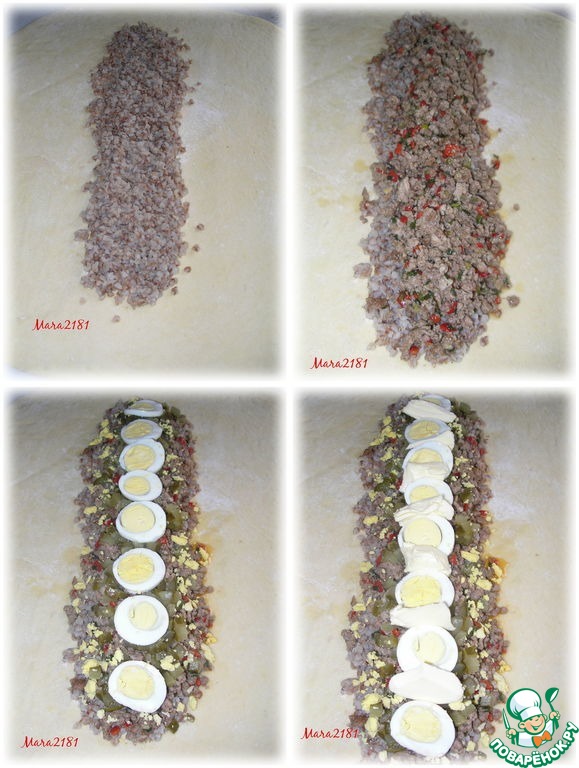 Теперь приступаю к работе с тестом. Раскатать его необходимого размера прямоугольного формы, чтобы в длину и ширину оно было немного больше противня. Раскатывать я начинаю сразу же на пергаментной бумаге, чтобы потом было легко переложить сформированную кулебяку на сам противень. Первым слоем на середину выкладываю полоской 1,5 стаканы сваренный гречневой крупы. Сверху 2-й слой - мясной фарш с болгарским перцем и зелёным луком. Далее поверх - нарезанный маринованный огурец. А сверху - порезанные кольцами сваренные вкрутую яйца. Раскрошившийся желток при нарезке также добавить в начинку, присыпав им равномерно по всей начинке. Последним слоем будут кусочки сливочного масла (50 г), которые я кладу между кольцами яиц.