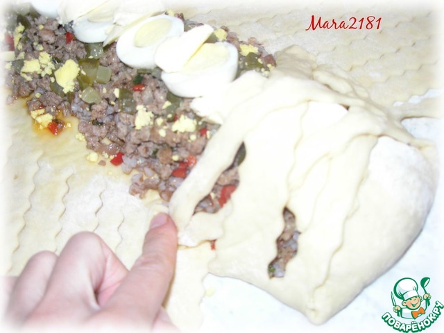 Подходя к завершению оформления кулебяки, предварительно подвернуть задний край и только потом поверх него закончить плетение, аккуратно спрятав края полосок под основание пирога.