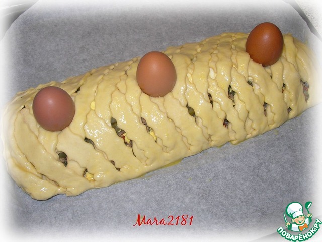 Сформированный пирог переложить на противень, приподняв его за края пергаментной бумаги. Тесто смазать взбитым яйцом и установить равномерно друг от друга сваренные вкрутую яйца (без трещин!). Оставить в тёплом месте для подъёма на 20-25 минут. Выпекать в предварительно разогретой до 180 градусов духовке 45-50 минут до румяности.