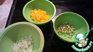 Готовим Нью Орлеанскую троицу (New Orleans trinity): репчатый лук, сладкий перец и сельдерей. Нарезаем все кубиком 5 мм. Сельдерей предварительно очищаем от грубых ребер жесткости с помощью овощечистки (экономки)