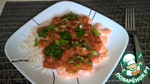В оригинальном рецепте креветки готовятся в горячем соусе, но они получаются переготовленными - "резиновыми". Поэтому я готовлю их отдельно.