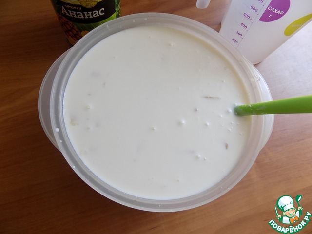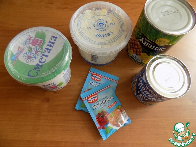 - Ананас (380 г в сиропе, можно взять и персики, и абрикосы тоже в сиропе) — 1 бан.