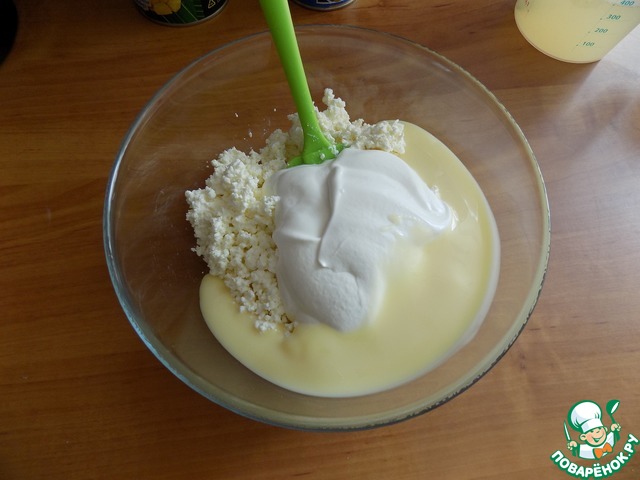 В посуду выкладываем творог, сметану, сгущённое молоко. Молока сразу 150 г не выкладывайте. Положите 100 г и потом вкус подкорректируете. Всё перемешиваем.