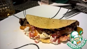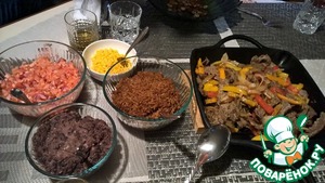• Разогреваем кукурузные лепешки тортилья в микроволновке и подаем к фахитос. Каждый для себя собирает лепешку. На лепешки (по центру и вдоль) выкладываеем пасту из черных бобов, тертый сыр, поверх него мясо с овощами, сверху соус Пико де Галья и дополняем все это сметаной.