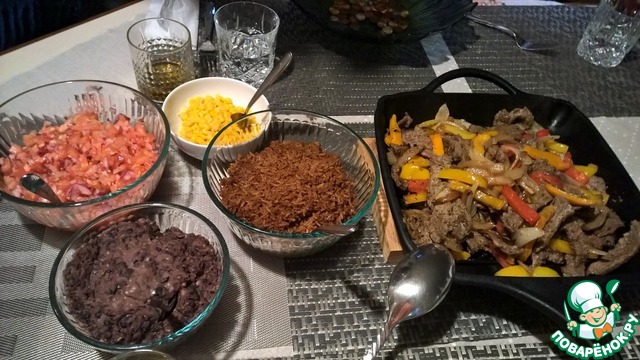 Фахитас (Fajitas) это одно из самых популярных и традиционных блюд мексиканской кухни. Фахитас это не просто жареное мясо в тортилье (кукурузной лепешке), но и обязательно традиционный набор гарниров или соусов: паста из черных бобов, рис с мексиканскими специями, соус Пико де Гальо и сметана. Мясо, бобы и рис готовятся с традиционными мексиканскими специями: кумином, орегано и, конечно, заправляются соком лайма. Без лука и жгучего перца в этой кухне тоже обойтись нельзя. Все эти ингредиенты гармонично дополняют друг друга и создают неповторимый колорит мексиканской кухни. Традиционно для Фахитас используют довольно дешевые и не очень мягкие отрезы говядины: брюшина, пашина и покромка (flank, round, skirt, London broil, etc.). Поэтому очень важно для Фахитас нарезать мясо очень тонкими полосками - поперек волокон. Тогда мясо быстро готовится и остается сочным - готовить надо на очень сильном огне. Конечно, никто Вам не запретит приготовить Фахитас из более дорогих - стейковых отрезов: толстый край, тонкий край, оковалок, кострец и огузок, ну и конечно вырезка. Хотя, в таком случае, это будут уже не совсем традиционные Фахитас. Ссылки на рецепты пасты из черных бобов, соуса Пико де Гальо и мексиканского риса даны в соответствующих шагах и в список ингредиентов эти продукты не включены.