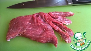 • Нарезаем мясо длинными узкими полосками (0.5 х 1 х 8 см). Если берем отрубы, указанные в ингредиентах, то кусок мяса уже будет нужной толщины, а если берем другой тип мяса, то его, возможно, придется нарезаать сначала на пластины, толщиной 1 - 1.5 см. Важно не делать толстые куски, потому, что нам нужно, чтобы мясо быстро прожарилось.