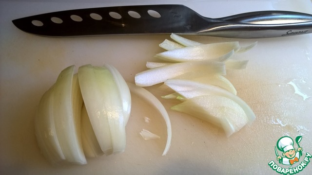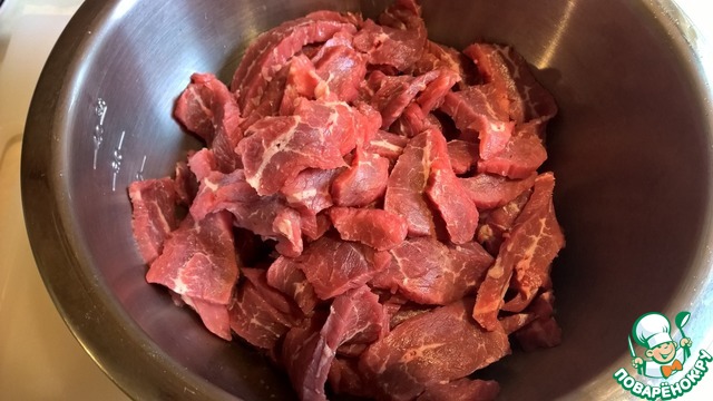 Нарезаем мясо длинными узкими полосками (0.5 х 1 х 8 см). Если берем отрубы, указанные в ингредиентах, то кусок мяса уже будет нужной толщины, а если берем другой тип мяса, то его, возможно, придется нарезаать сначала на пластины, толщиной 1 - 1.5 см. Важно не делать толстые куски, потому, что нам нужно, чтобы мясо быстро прожарилось.