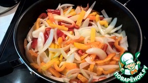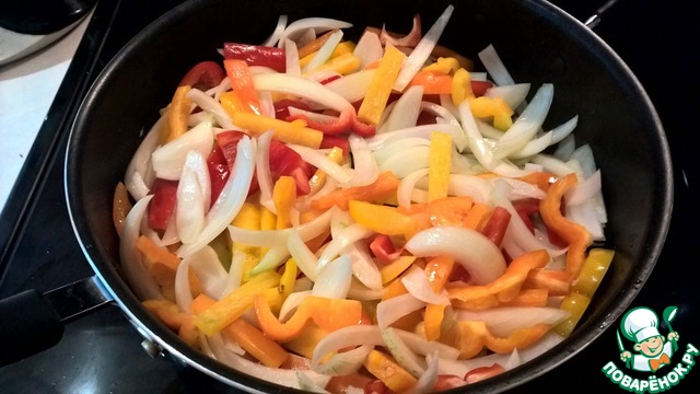 Обжариваем лук и перец на сковороде с добавлением растительного масла. Овощи должны остаться слегка хрустящими