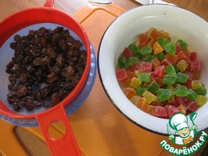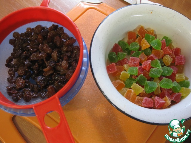 • Тем временем подготовить наши добавки, - изюм замочить на пару минут в кипятке, цукаты нарезать помельче