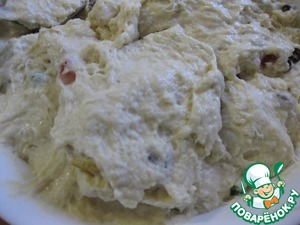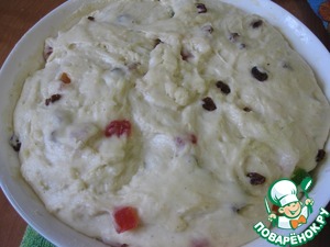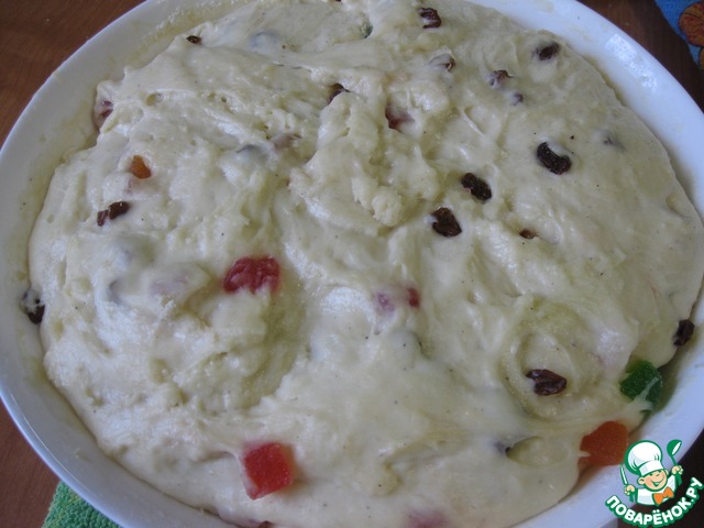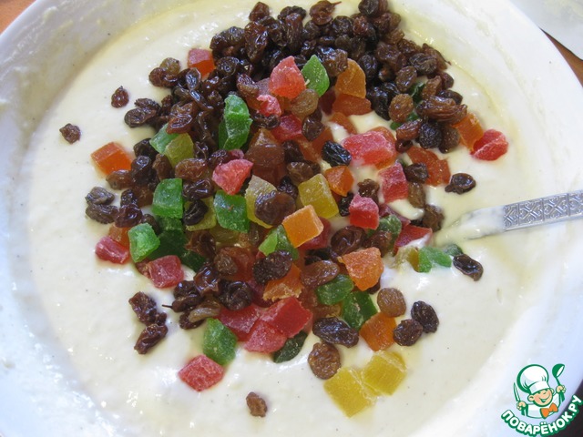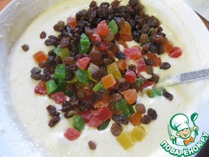 • Всыпаем половину муки, вымешиваем и добавляем изюм и цукаты