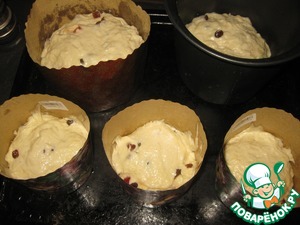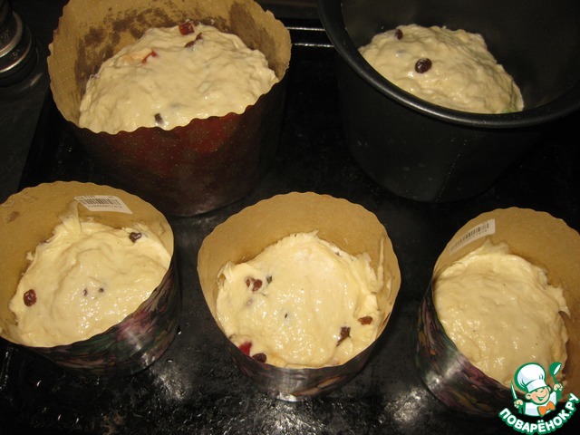 • Готовое тесто разложить по формам на 2/3 от объема и поставить снова на расстойку (приношу извинения за такое темное фото)