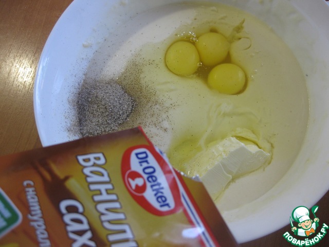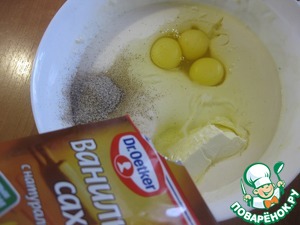 • В подошедшую опару добавляем яйца, сгущенное молоко, размягченное масло и ванильный сахар