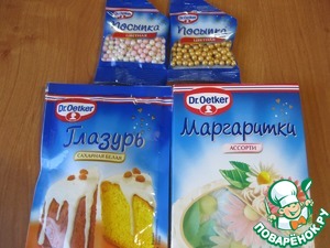 • А теперь приступим к украшению, - у меня пакетик готовой глазури от Dr. Oetker, сахарные бусины и маргаритки от Dr. Oetker.