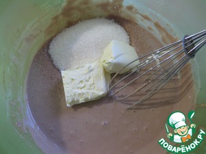 В подошедшую опару добавить сахар и масло и хорошо все взбить