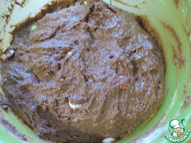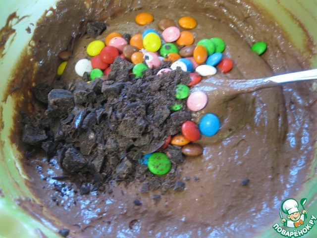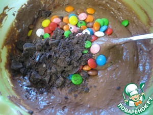 Всыпать половину муки, размешать и добавить кусочки шоколада и драже или капли, вмешать их в тесто