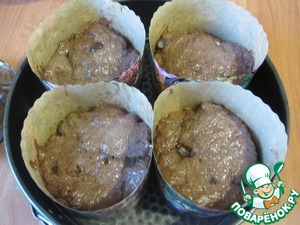 Разложить по формам примерно на 1/2 (тесто очень поднимается в процессе выпечки)и поставить до увеличения теста в два раза. Вот тут я совсем закрутилась, и забыла переставить их на противень для расстойки, а когда вспомнила, было уже поздно, мои куличики срослись ( ( Пришлось выпекать так, а потом как можно аккуратнее разделять этих "сиамских близнецов". Но к счастью, на вкусе это никак не отразилось.