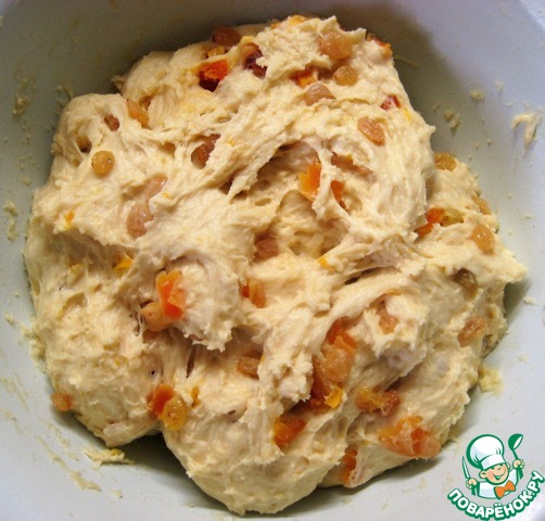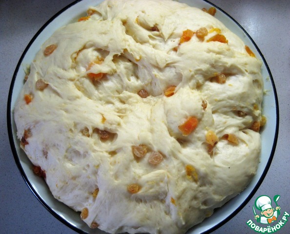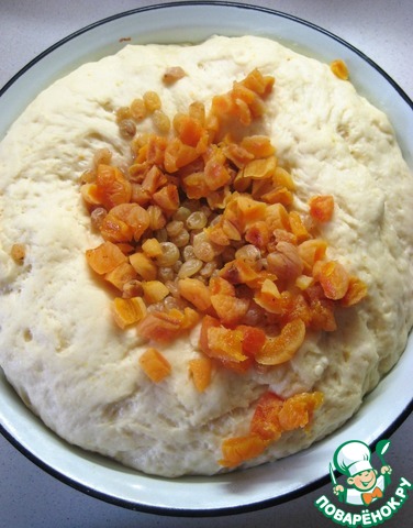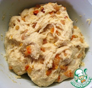 Тесто увеличилось в объеме. Добавляем изюм и курагу, вмешивая их в тесто (изюм и курагу предварительно залить кипятком, оставить минут на 10-15, затем воду слить и обсушить сухофрукты салфеткой, курагу нарезать кусочками по размеру примерно как и изюм).