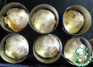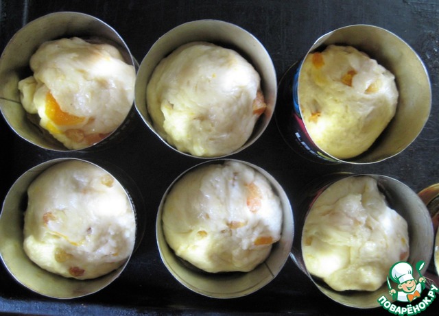 Поднявшееся тесто обминаем. Отрываем кусочек теста, подкатывая его руками в шарик, и заполняем форму для куличей, чтобы заполнить её примерно на 1/3 (стенки форм я смазала растительным маслом, дно застелила кружочком пергаментной бумаги).